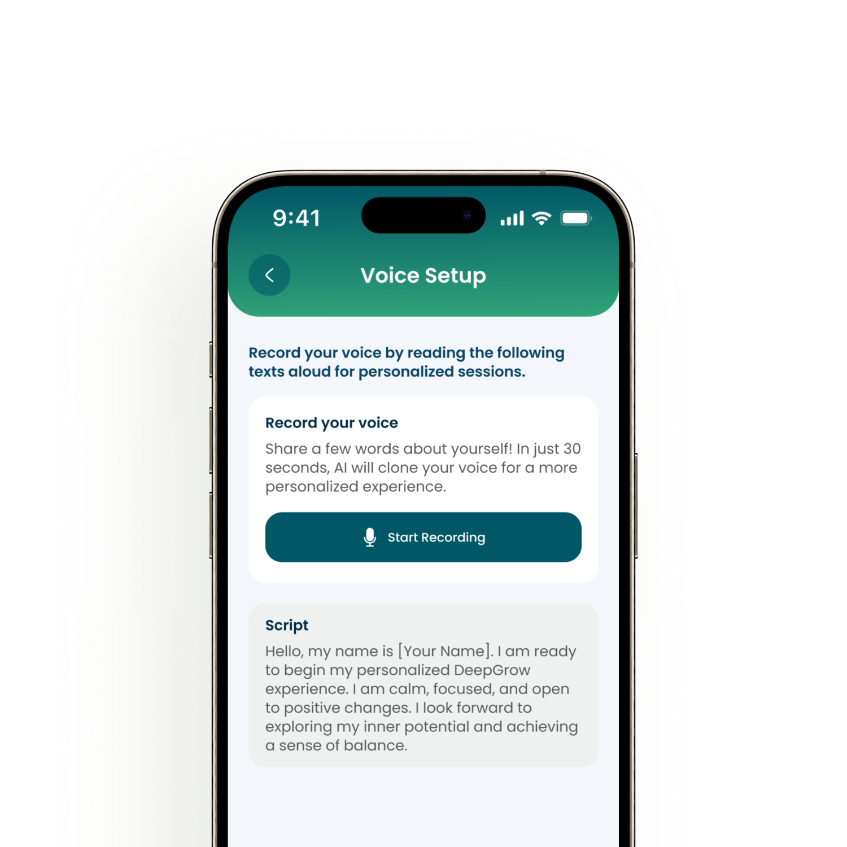 Wähle, wie es klingt. Passe Musik und Ton an oder nimm deine eigene Stimme auf – DeepGrow entwickelt sich mit dem, worauf dein Geist am besten reagiert.